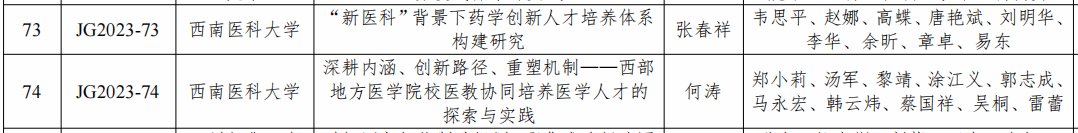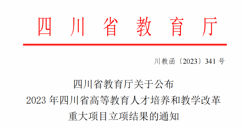 近日,四川省教育厅发布《四川省教育厅关于公布2023 年四川省高等教育人才培养和教学改革重大项目立项结果的通知》(川教函〔2023〕341号),学校《“新医科”背景下药学创新人才培养体系构建研究》(项目负责人:张春祥教授)、《深耕内涵、创新路径、重塑机制—西部地方医学院校医教协同培养医学人才的探索与实践》(项目负责人:何涛教授)2个项目获得立项。