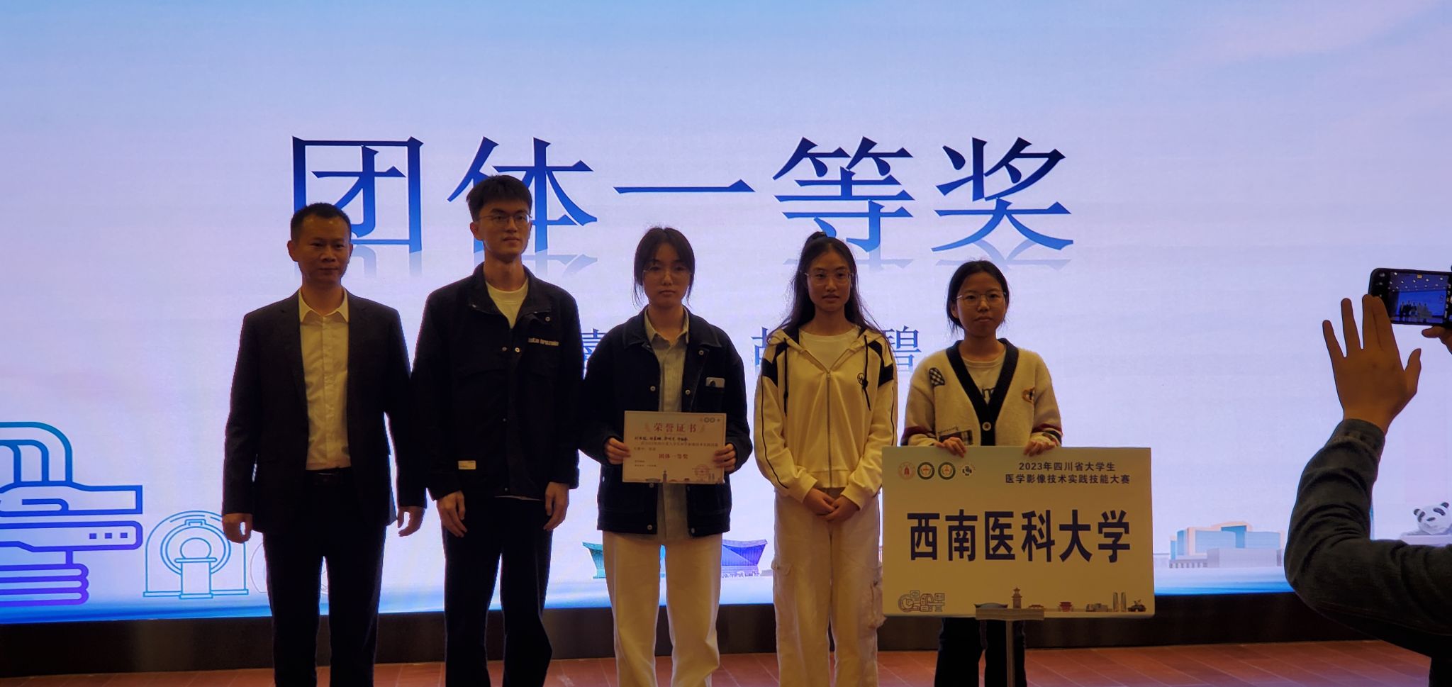 日前,由四川省教育厅主办、四川大学承办的“2023年四川省大学生医学影像技术实践技能大赛”顺利举行。在学校、院系领导的高度重视和大力支持下,我校医学影像系医学影像技术专业2020级刘佳妮、任星樾、郭昕月、许桂彰4名学生组成参赛队伍,从参赛的四川大学临床医学院、西南科技大学等8支代表队中杀出重围,再次斩获团体一等奖,并获得单项二等奖3项,单项三等奖1项。