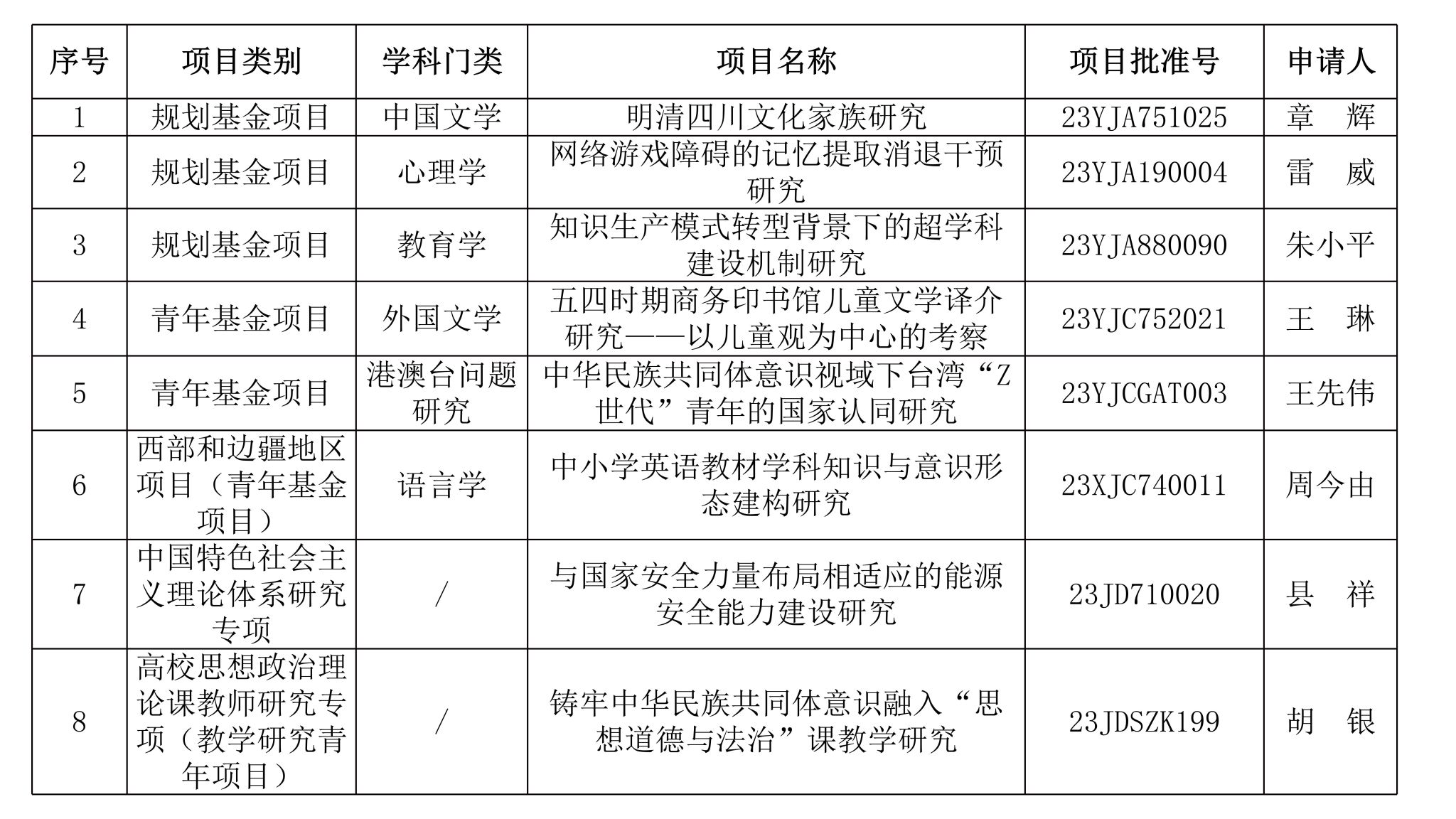 近日,教育部社科司公布2023年度教育部人文社会科学研究一般项目和高校思想政治理论课教师研究专项一般项目立项结果,我校共有8个项目获得立项资助,其中规划基金项目3项,青年基金项目2项,西部和边疆地区项目1项,中国特色社会主义理论体系研究专项1项,高校思想政治理论课教师研究专项1项。加上已立项的国家社科基金项目1项,今年我校共获批高级别社科类科研项目共9项,创历史新高,较好地展现了我校的社科研究实力和水平。