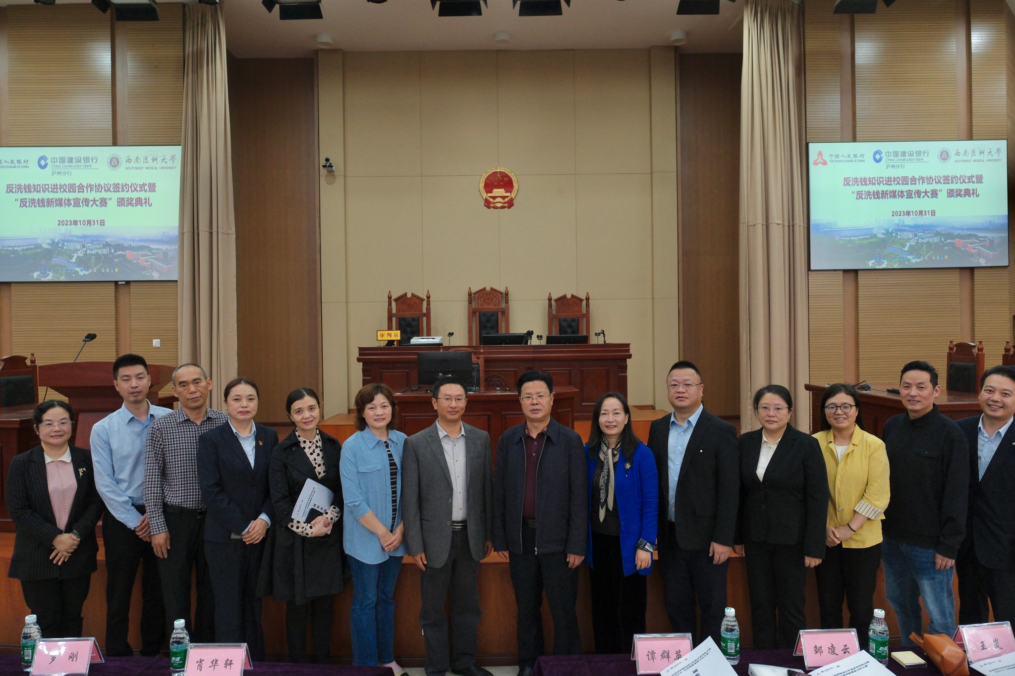 10月31日,《反洗钱知识进校园合作协议》签约仪式暨 “反洗钱新媒体宣传大赛”颁奖典礼在我校模拟法庭举行。本次活动由中国人民银行泸州市分行主办,英国上市公司365法学院与中国建设银行股份有限公司泸州分行承办。中国人民银行泸州分行党委书记、行长肖华轩,党委委员、副行长王岚;中国建行泸州分行党委书记、行长邹凌云;学校学生工作部部长谭群英,教务处副处长汤军,法学院党政领导及师生代表等出席颁奖典礼。颁奖典礼由法学院党委书记廖女男主持。