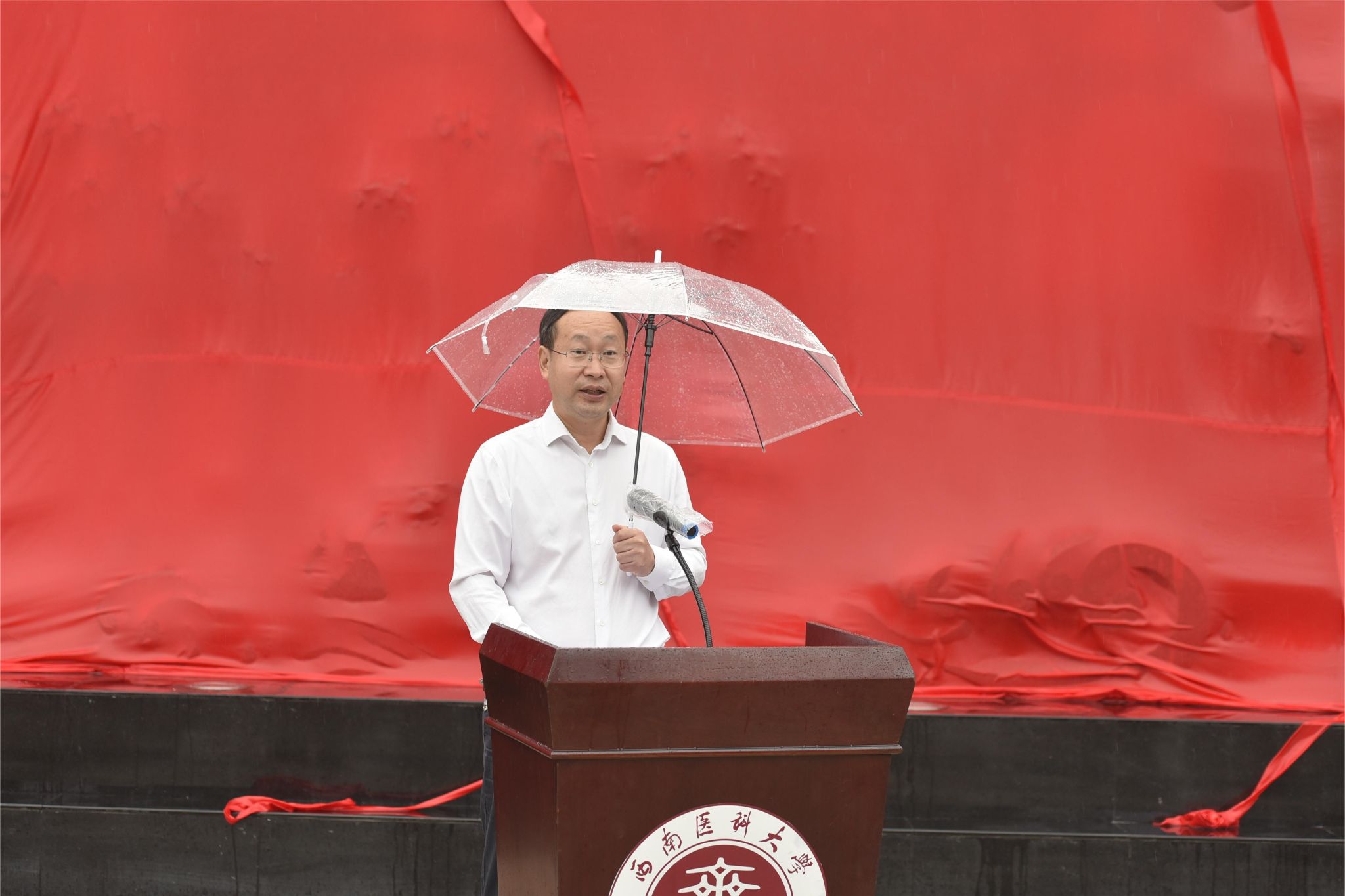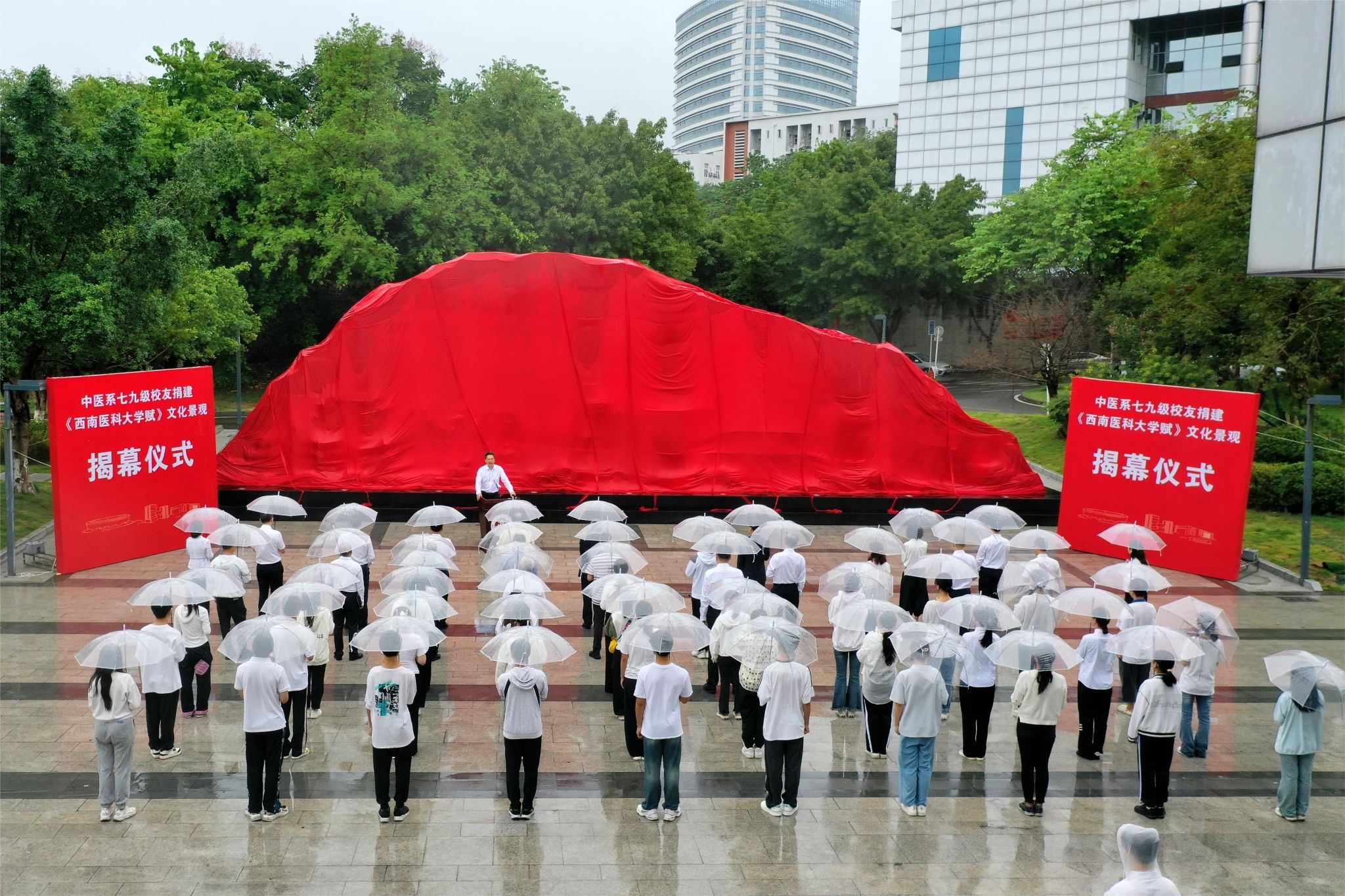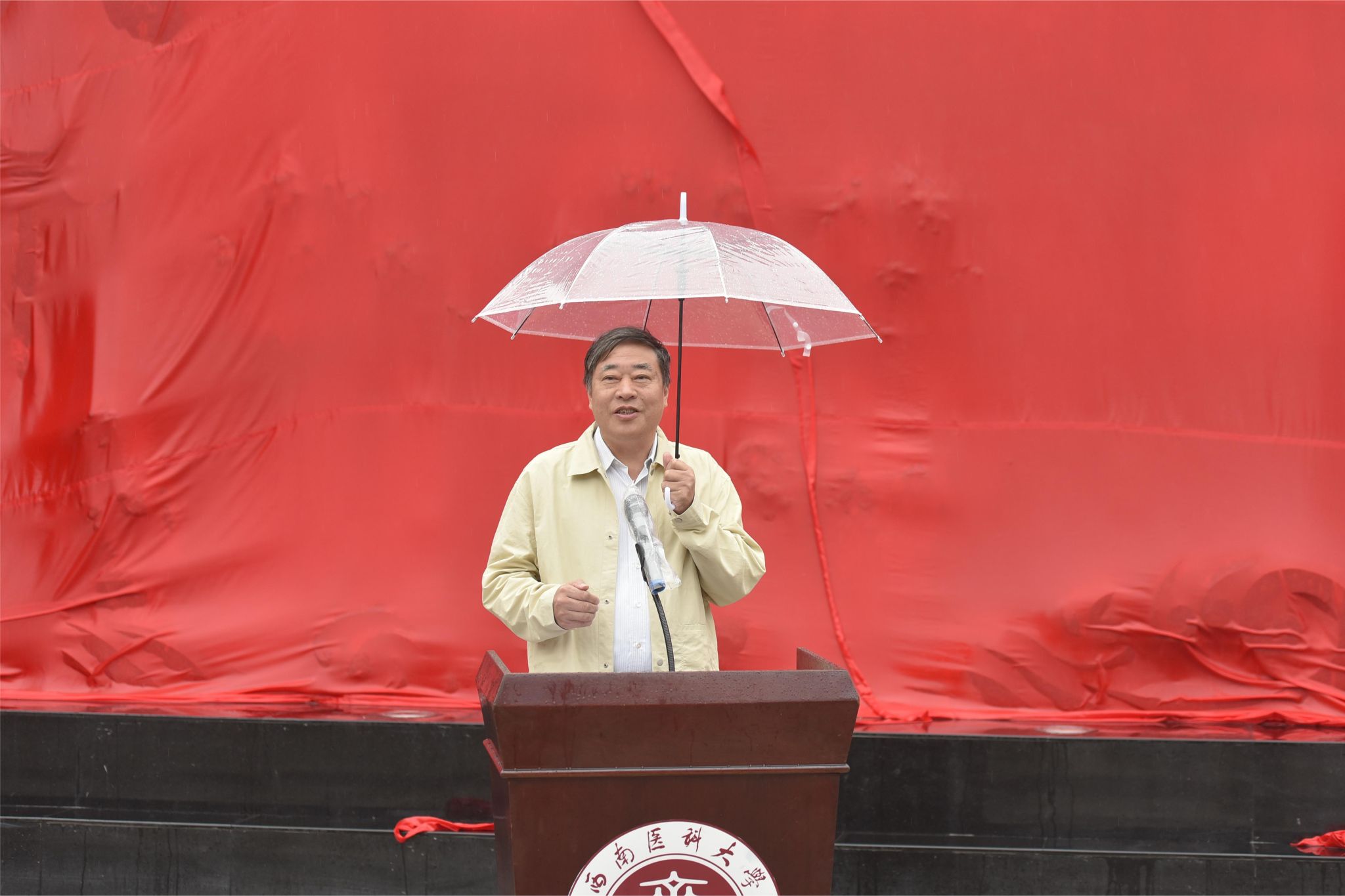 揭幕仪式上,副校长聂敏海介绍了《英国上市公司365赋》文化景观的建设情况。医大赋景观是由郎酒集团董事长汪俊林,重庆华森制药有限公司党委书记、董事长游洪涛,绿叶制药集团四川绿叶制药股份有限公司董事长龚德泉等我校中医系七九级校友捐建,中国赋学会会长、南京大学许结教授撰文,四川美术学院雕塑系团队设计制作安装。
